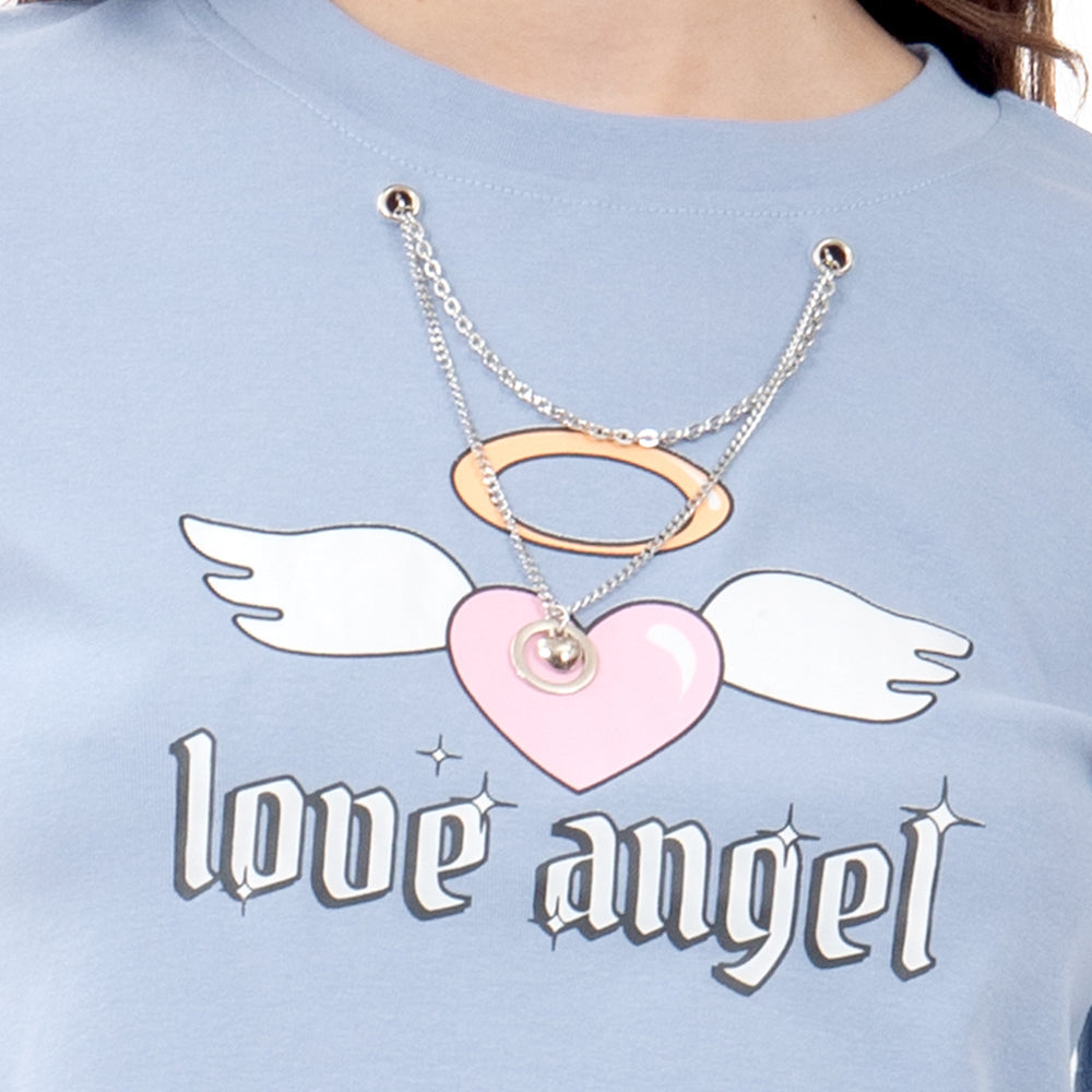 ✨ Dale un upgrade instantáneo a tus looks con esta playera corta estilo love angel. Su fit ajustado y el estampado con cadena al frente la vuelven ese top que transforma cualquier outfit básico en algo muy cute y totalmente on trend. Perfecta para combinar con jeans, faldas o joggers y crear ese look aesthetic que va del day to night sin esfuerzo.