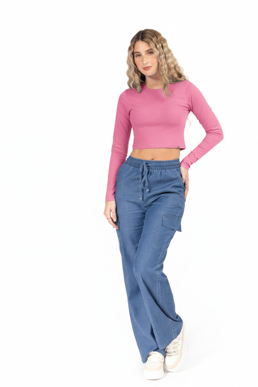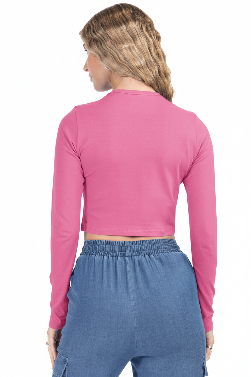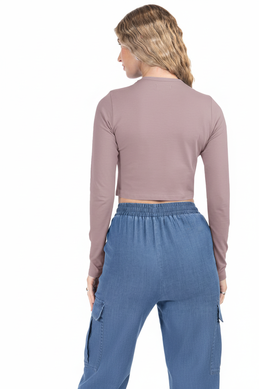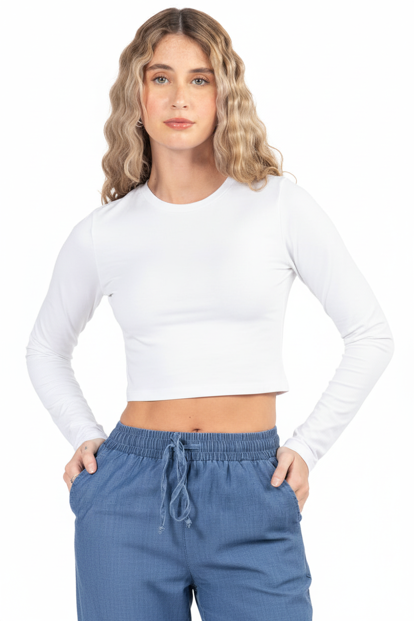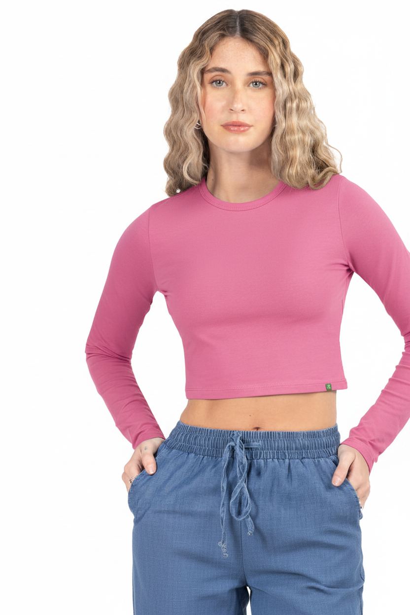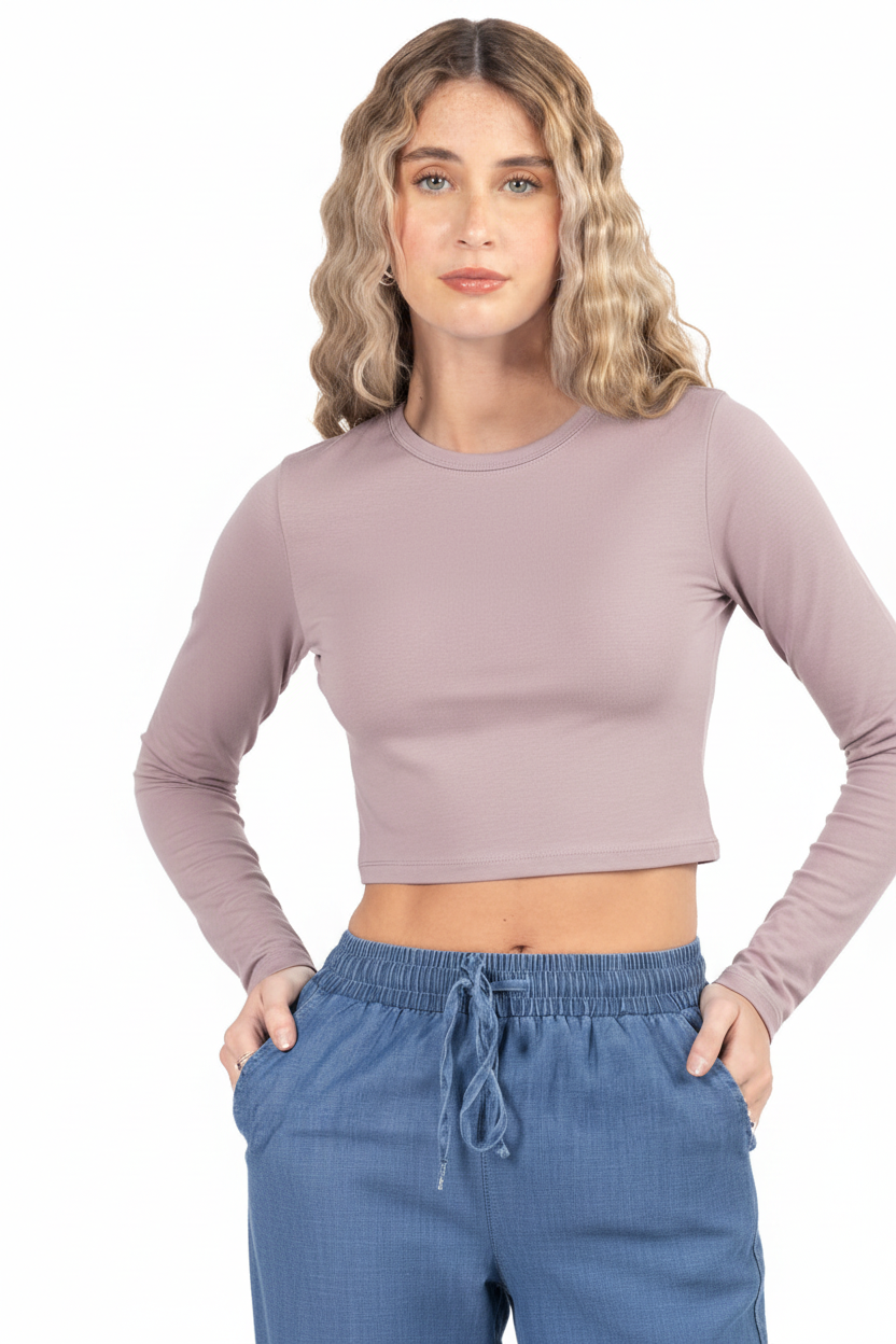 Eleva tu look diario: top slim fit de manga larga y corte cropped que define la cintura sin perder comodidad. Su color suave lo hace fácil de combinar.