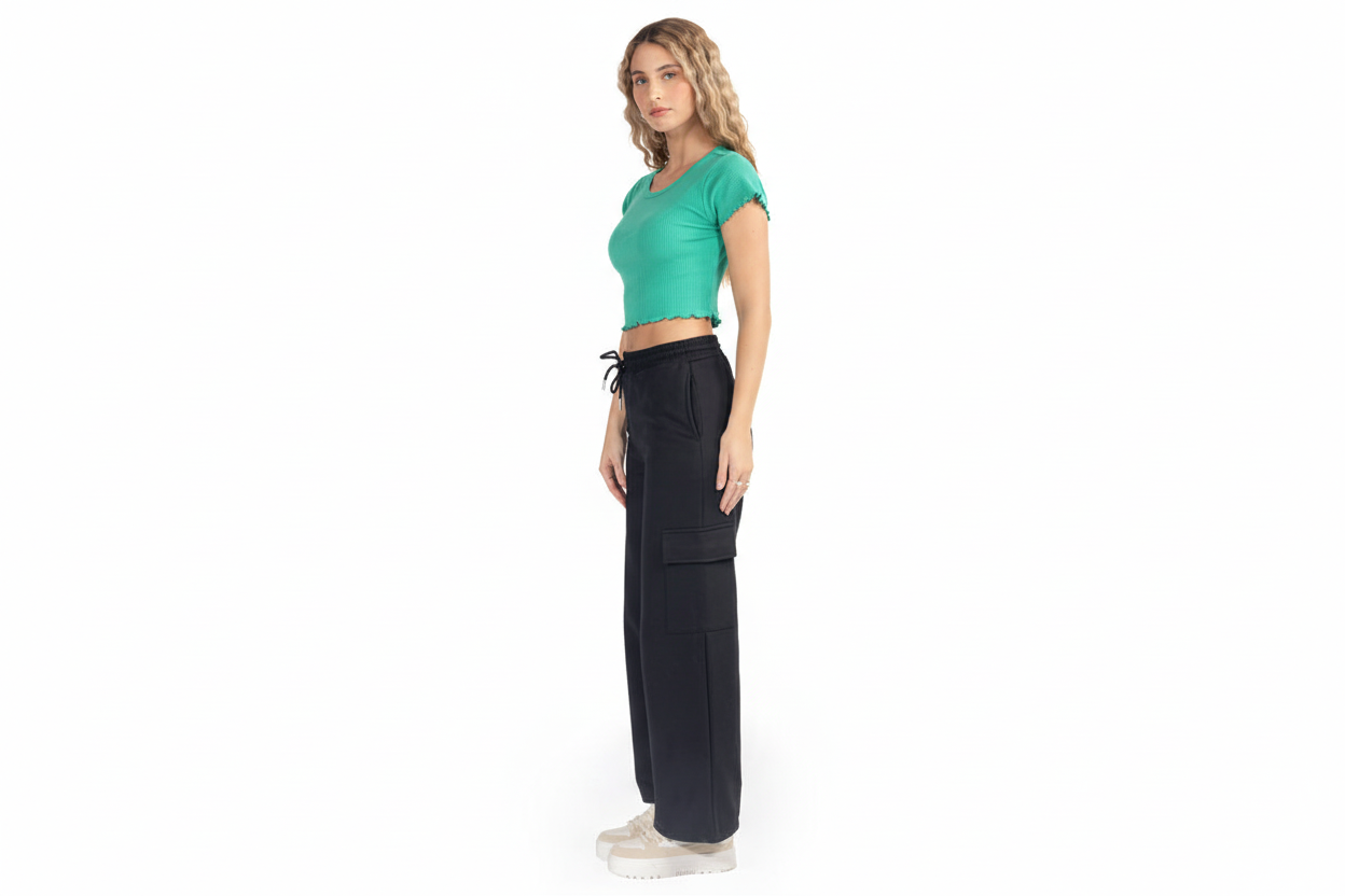 ✨ Esta playera crop de manga corta es el basic cute que eleva cualquier outfit. Su tejido acanalado abraza la silueta, el largo corto marca la cintura y el detalle ondulado en mangas y dobladillo le da un toque girly perfecto para tus looks day to night.
