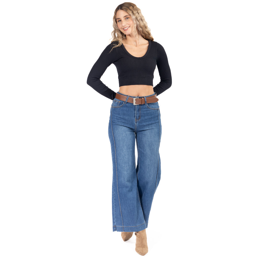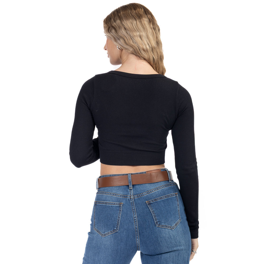 Second-skin vibes. Crop top slim fit de manga larga con construcción seamless y textura acanalada que se amolda al cuerpo sin marcas. Escote en U que favorece clavículas y cintura definida para un look clean y sexy—dress it up or keep it casual.