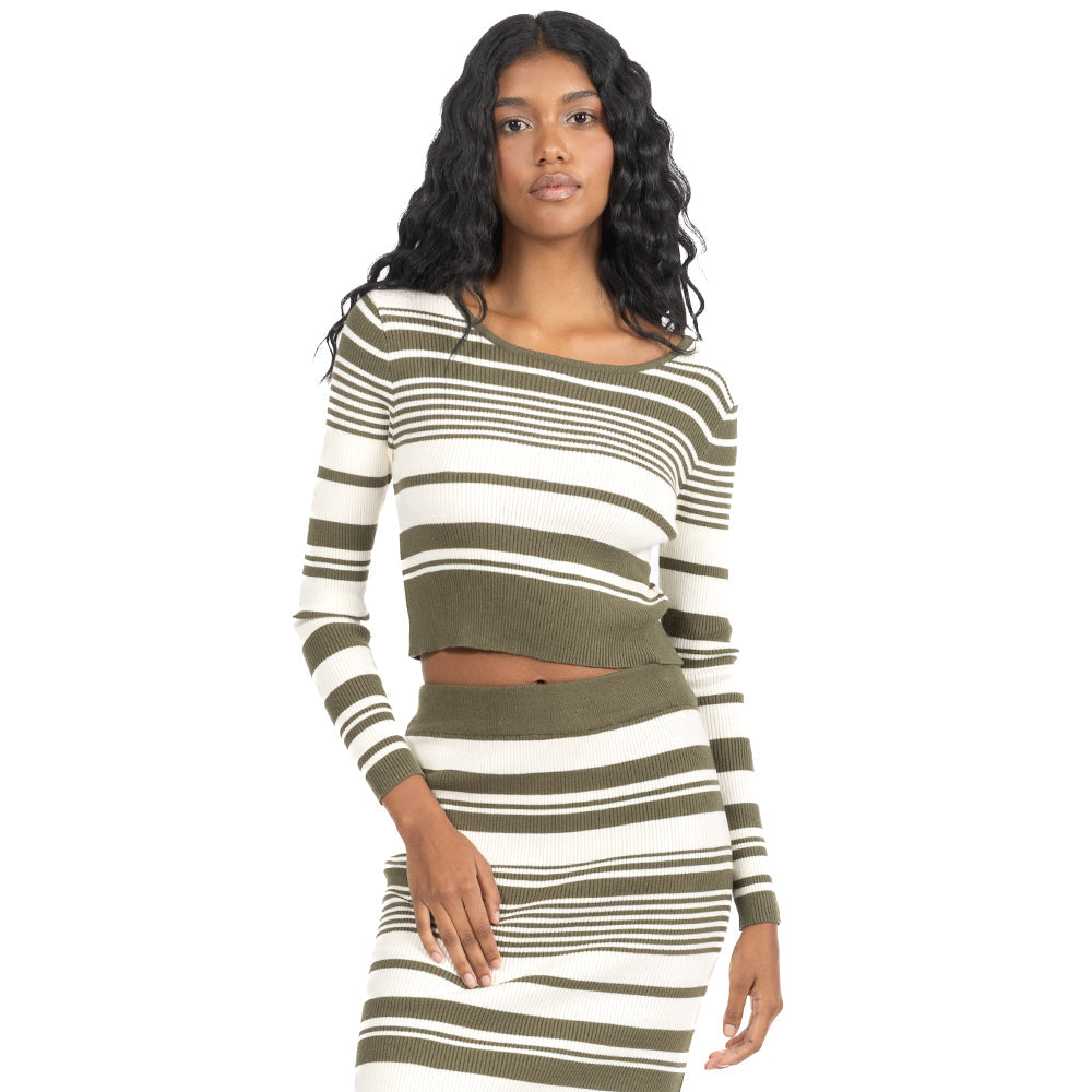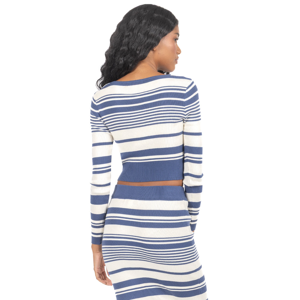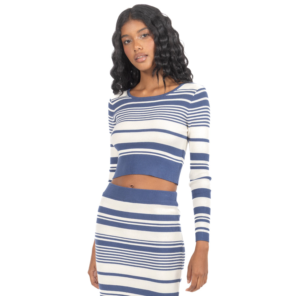 Stripe it, love it. Top tejido de manga larga con silueta slim y corte crop que abraza la cintura y luce súper favorecedor. El mix de rayas azul/ivory y el punto acanalado le dan ese vibe moderno y pulido—perfect day to night, con denim o en set.