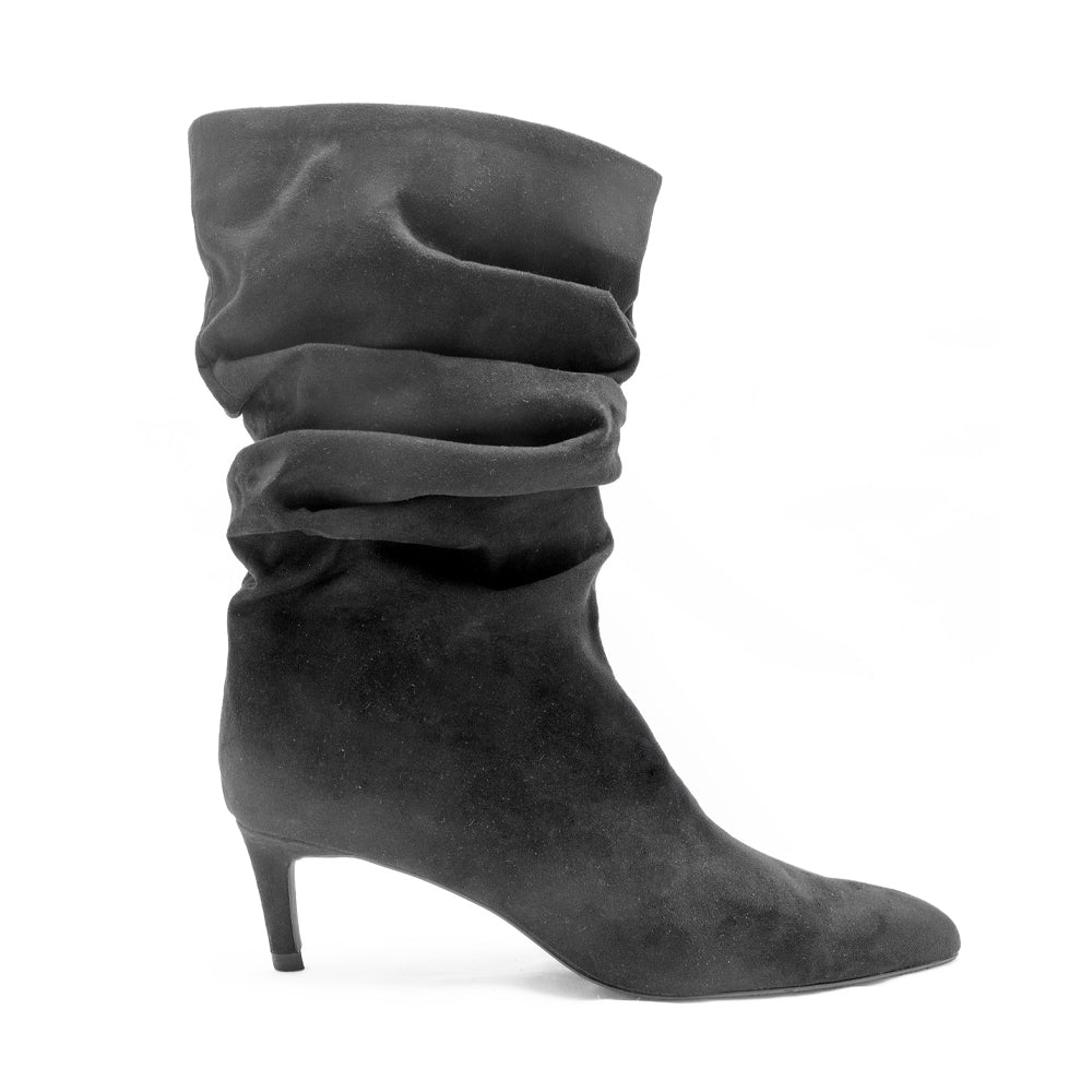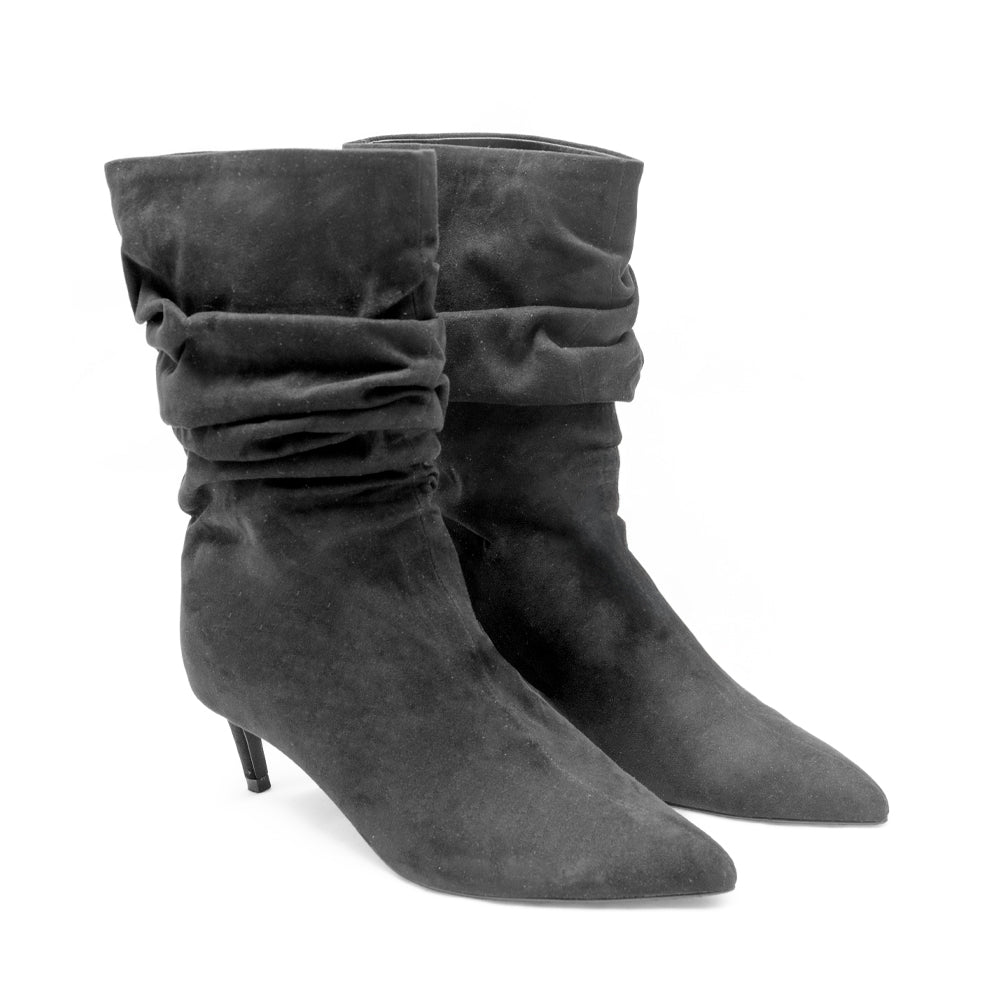 ¡El toque chic que actualiza cualquier outfit! Este botín tipo gamuza en negro suma una vibra sleek con su caña fruncida y punta fina que alarga visualmente la pierna. El tacón kitten agrega altura cómoda para llevarlo day to night: del café con amigas al night out sin perder estilo.