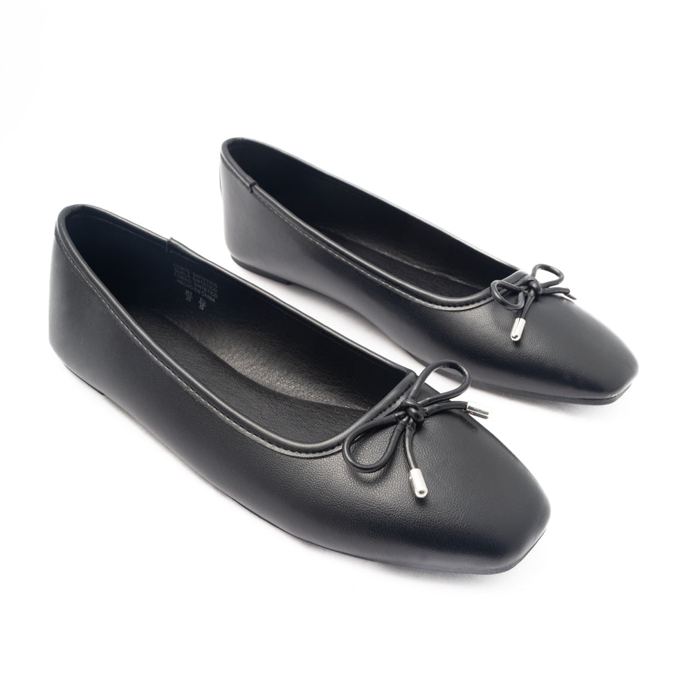 Eleva tu look con las go-to flats de la temporada. Estas bailarinas negras con punta cuadrada y moño minimal son puro chic: un básico versátil que va de office to out en segundos, con estilo limpio y comfy fit para todos tus días.