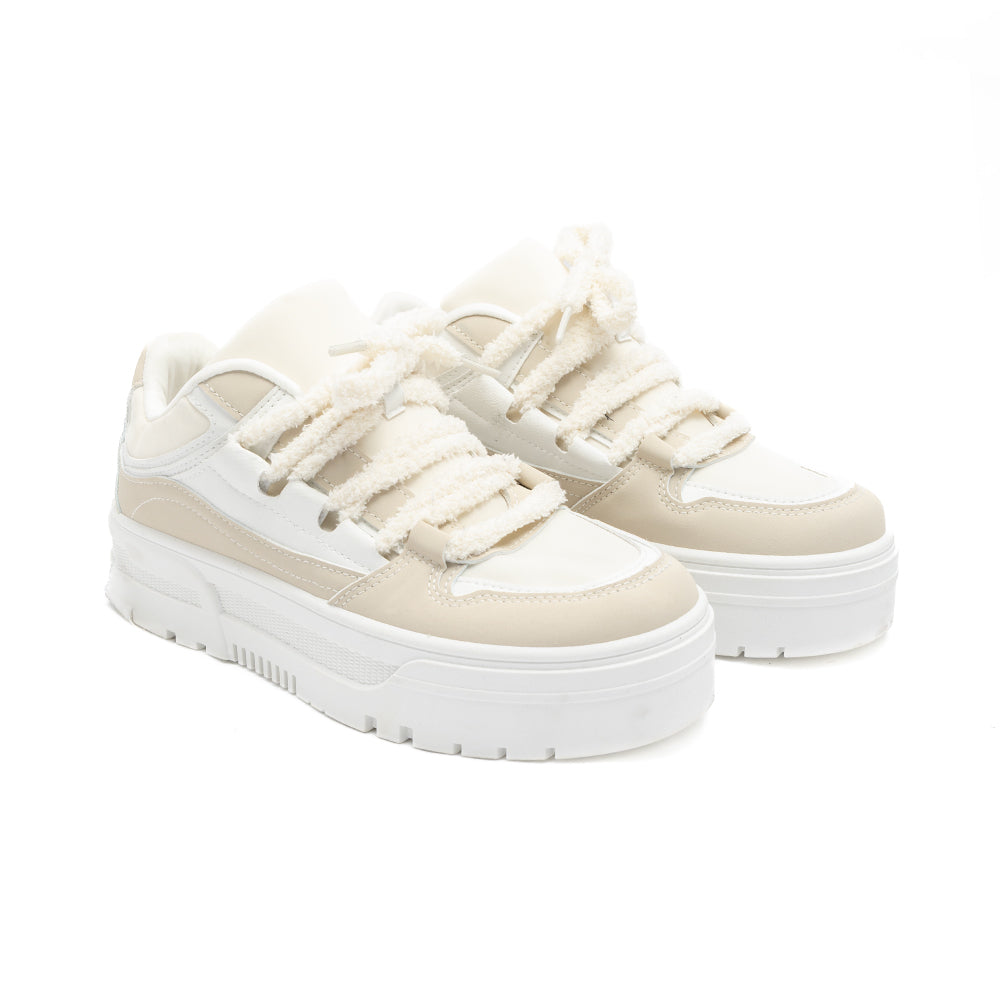 Trend alert: los chunky sneakers que elevan cualquier look. Estos tenis en tonos crema y blanco con plataforma ligera y agujetas tipo cozy aportan ese street vibe que va de brunch a night out sin esfuerzo. Mix and match con jeans, joggers o vestidos y logra un upgrade instantáneo. Ready to stand out?
