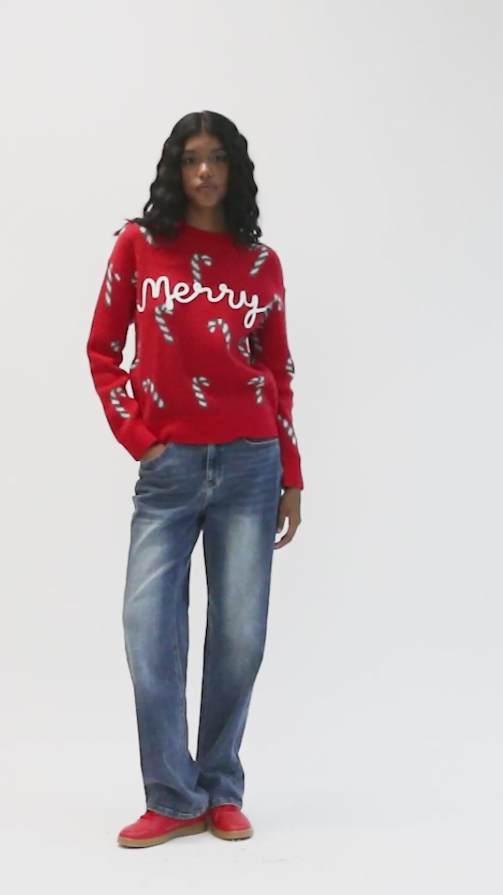 ✨ Holiday mood on. El sweater navideño que enciende cualquier outfit: rojo vibrante, lettering Merry al frente y candy canes all over para un vibe ultra fun. Su tejido suave y comfy te abraza sin picar; úsalo con denim, mini satinada o sobre camisas para un layering de impacto. Party-ready y photo-friendly.