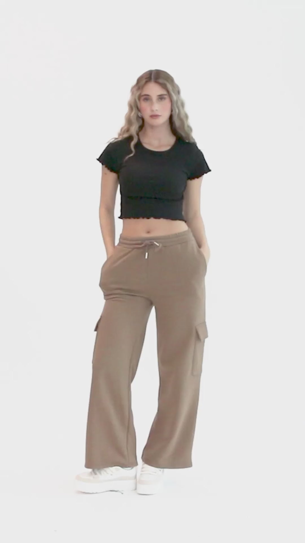 ✨ Esta playera crop de manga corta es el basic cute que eleva cualquier outfit. Su tejido acanalado abraza la silueta, el largo corto marca la cintura y el detalle ondulado en mangas y dobladillo le da un toque girly perfecto para tus looks day to night.