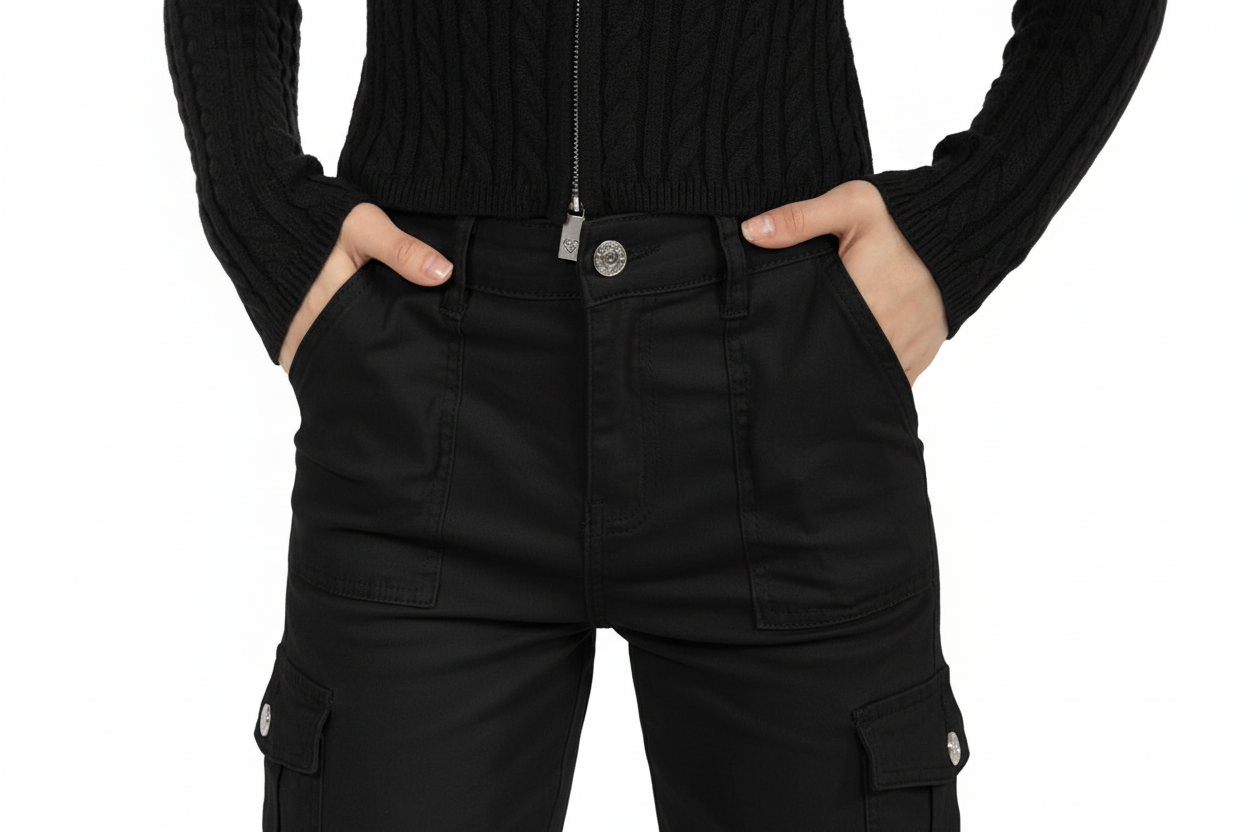 🔥 Cargo denim, tendencia que no falla. Jeans con bolsillos de tapa y botón para un look utilitario y estilizado.