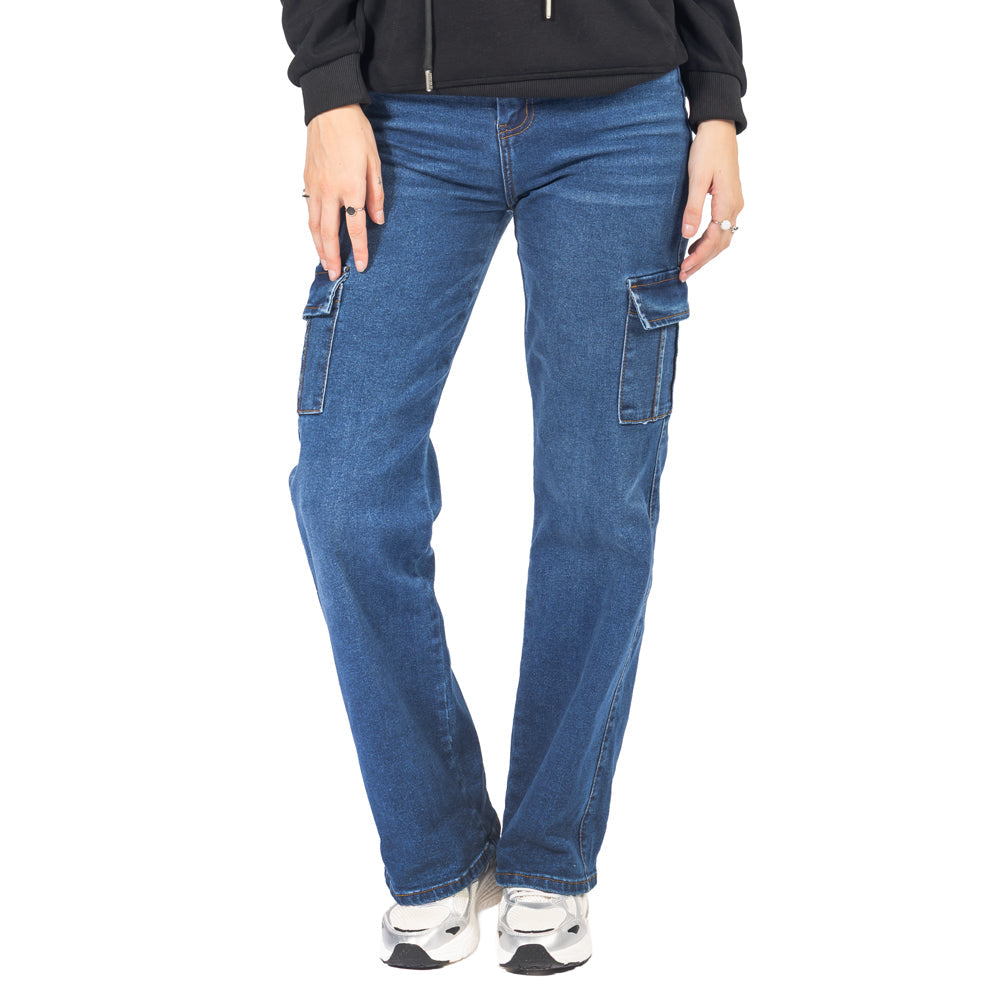 Ready to add to cart? Sube tu estilo con estos jeans cargo de mujer: jeans wide leg, denim claro con bolsillos, fit relajado con stretch y vibra urbana.