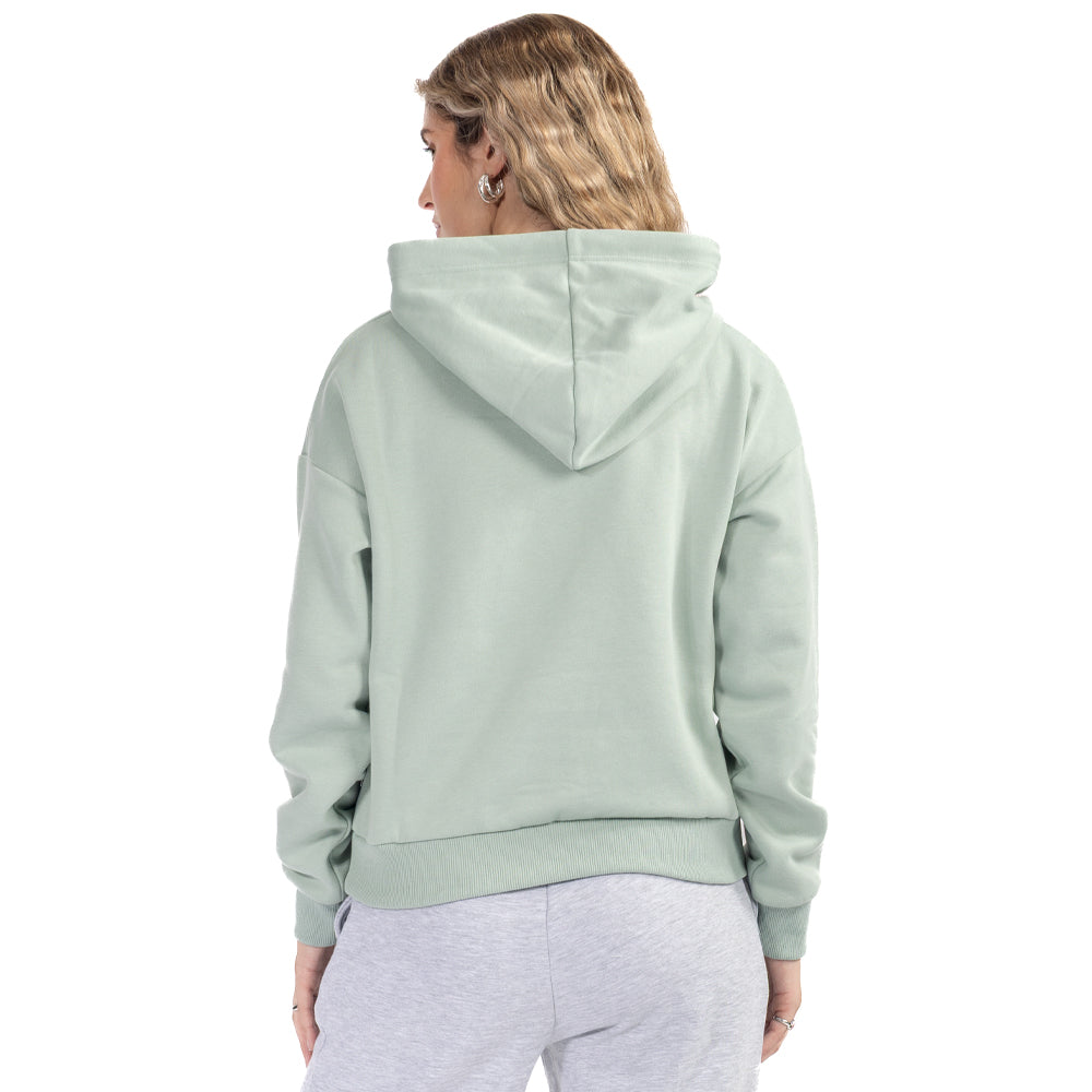 Cozy but make it chic. Hoodie en tono verde menta con lettering en relieve y bolsillo canguro que eleva tus basics al instante. Fit relajado, capucha con jareta y vibe street-ready para llevar de lunes a domingo—coffee run to chill night, sin esfuerzo.