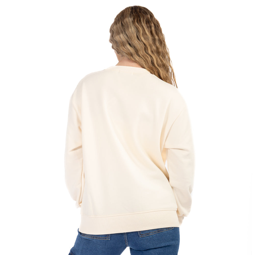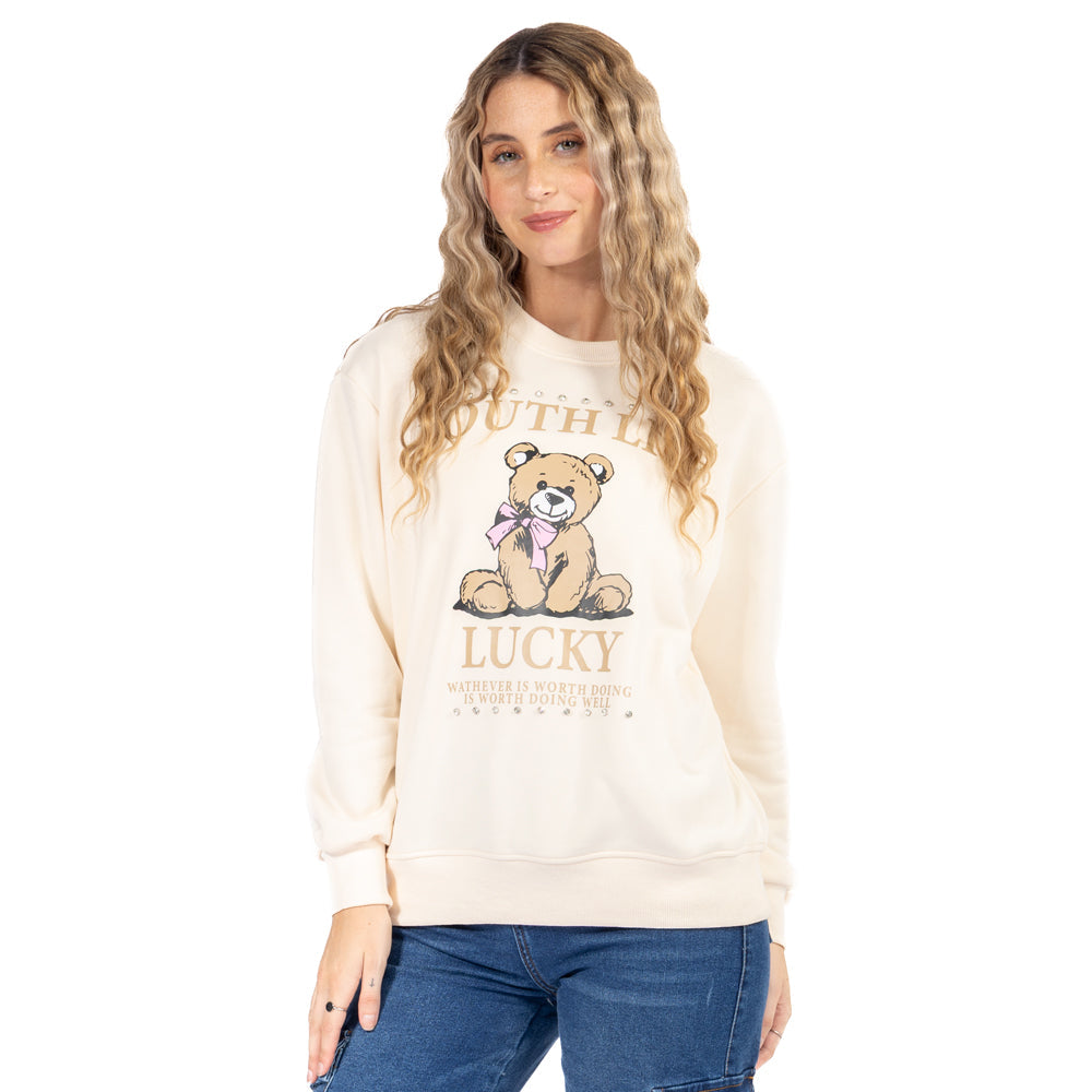 Lista para el carrito: sudadera estampada mujer, cuello redondo, color crema, estilo coquette-street. Add to cart y eleva tus basics con un toque adorable.