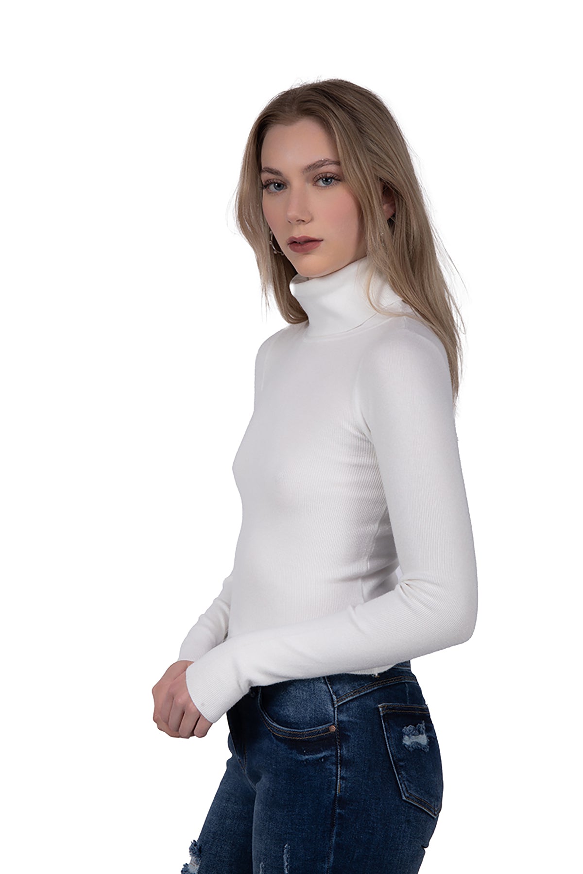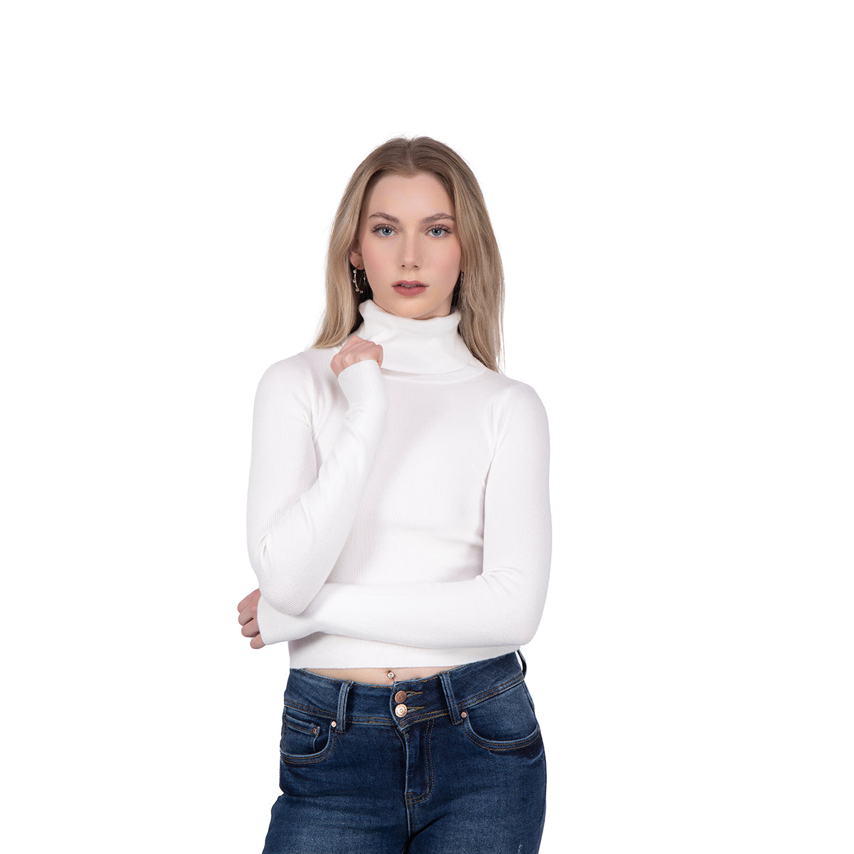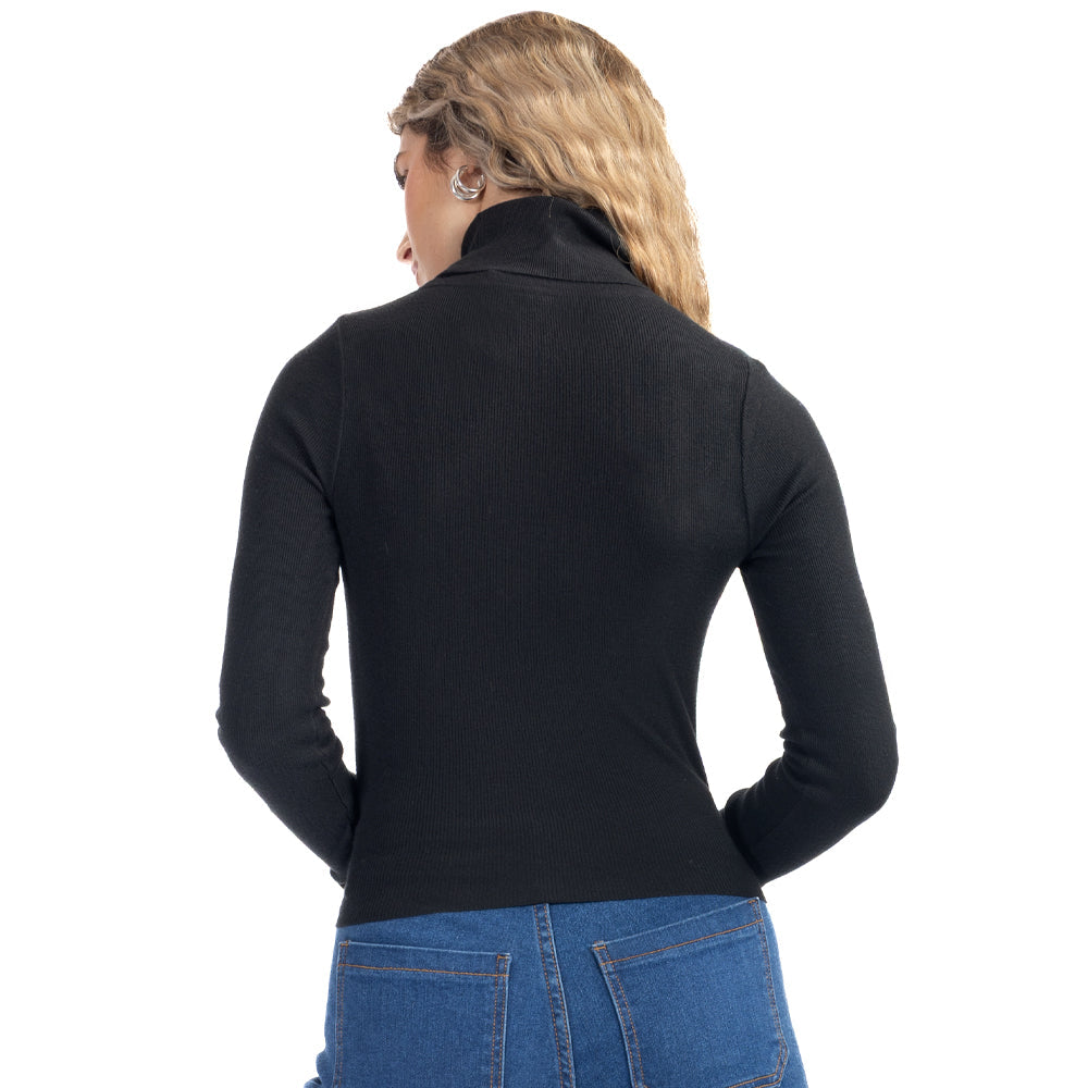 Cuello alto que aporta calidez y un toque elegante, perfecto para accesorios y aretes statement.