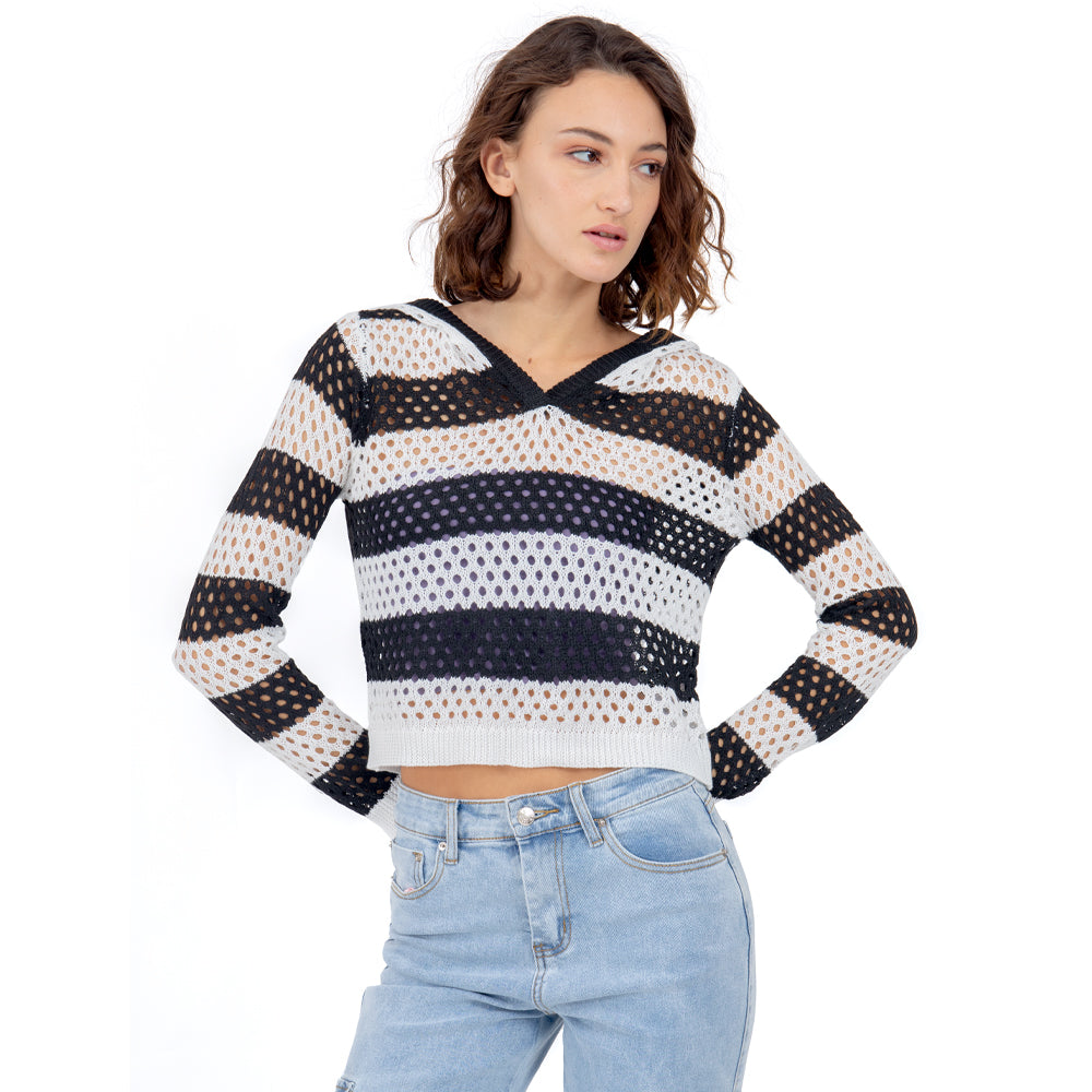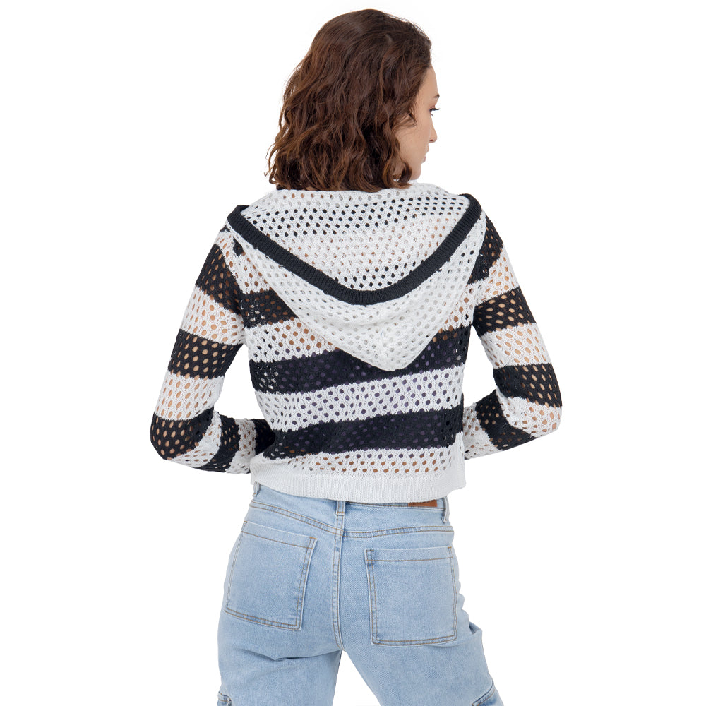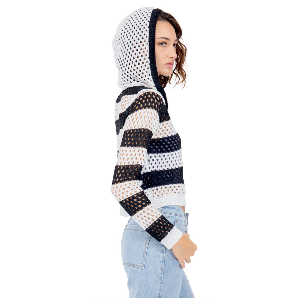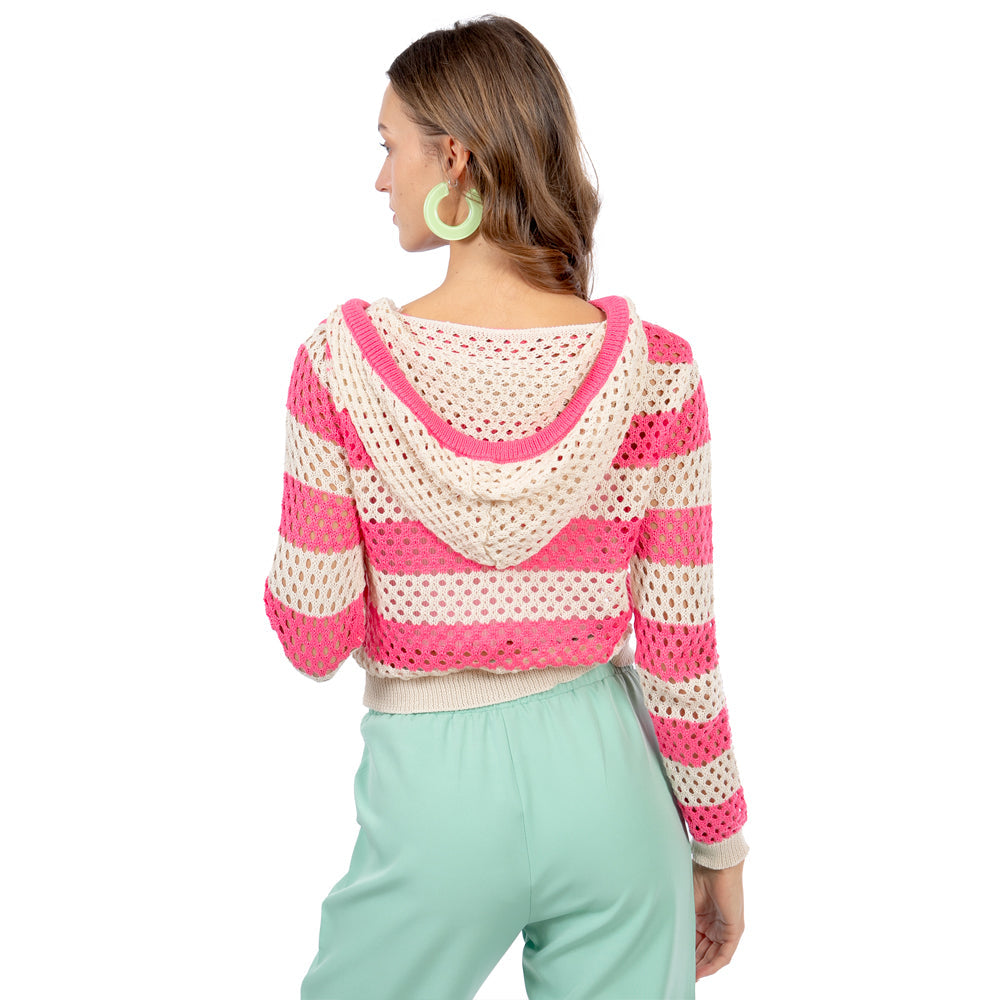 • 🔥 Beneficios: Corte crop que favorece la cintura, capucha con toque sporty-chic, franjas que estilizan y construcción calada perfecta para capas en cualquier temporada.