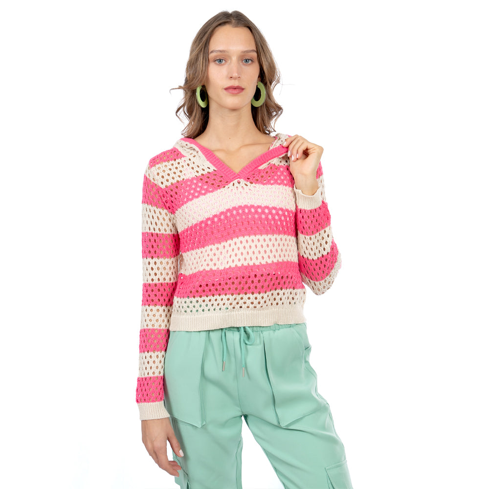 ✨ El knit que eleva cualquier look. Nuestro sweater crop tejido con capucha mezcla franjas bold y punto calado para un efecto airy súper trendy; úsalo para hacer layering con bralettes, camisas o bikinis y consigue un vibe effortless.