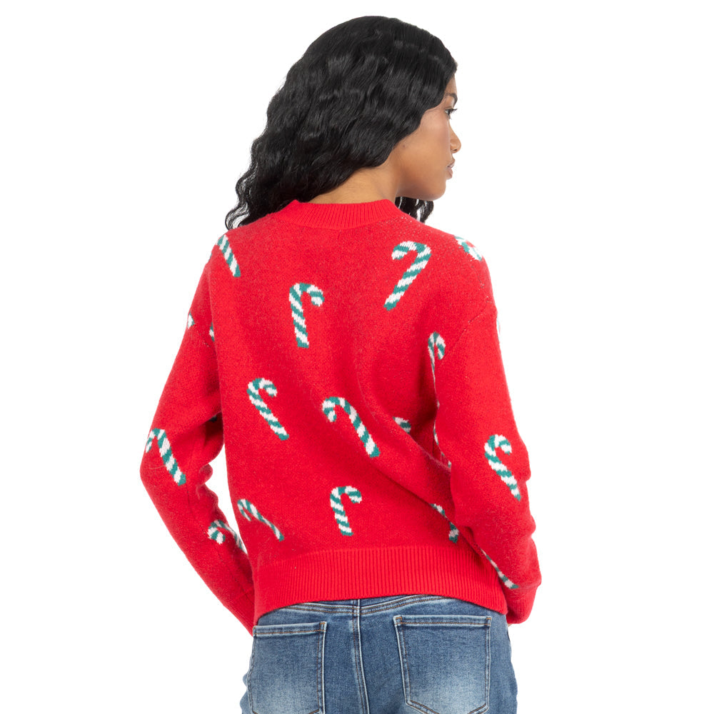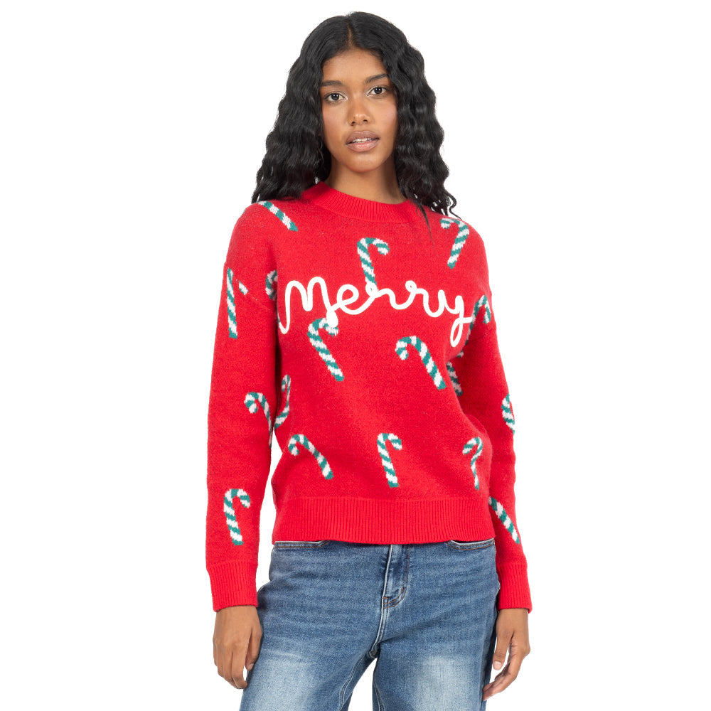 Holiday mood on. El sweater navideño que enciende cualquier outfit: rojo vibrante, lettering Merry al frente y candy canes all over para un vibe ultra fun. Su tejido suave y comfy te abraza sin picar; úsalo con denim, mini satinada o sobre camisas para un layering de impacto. Party-ready y photo-friendly.
