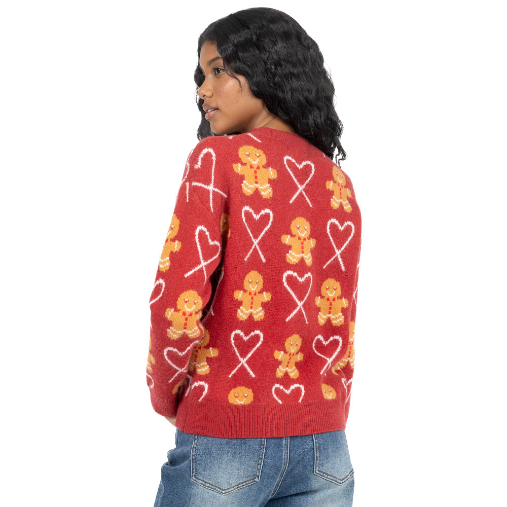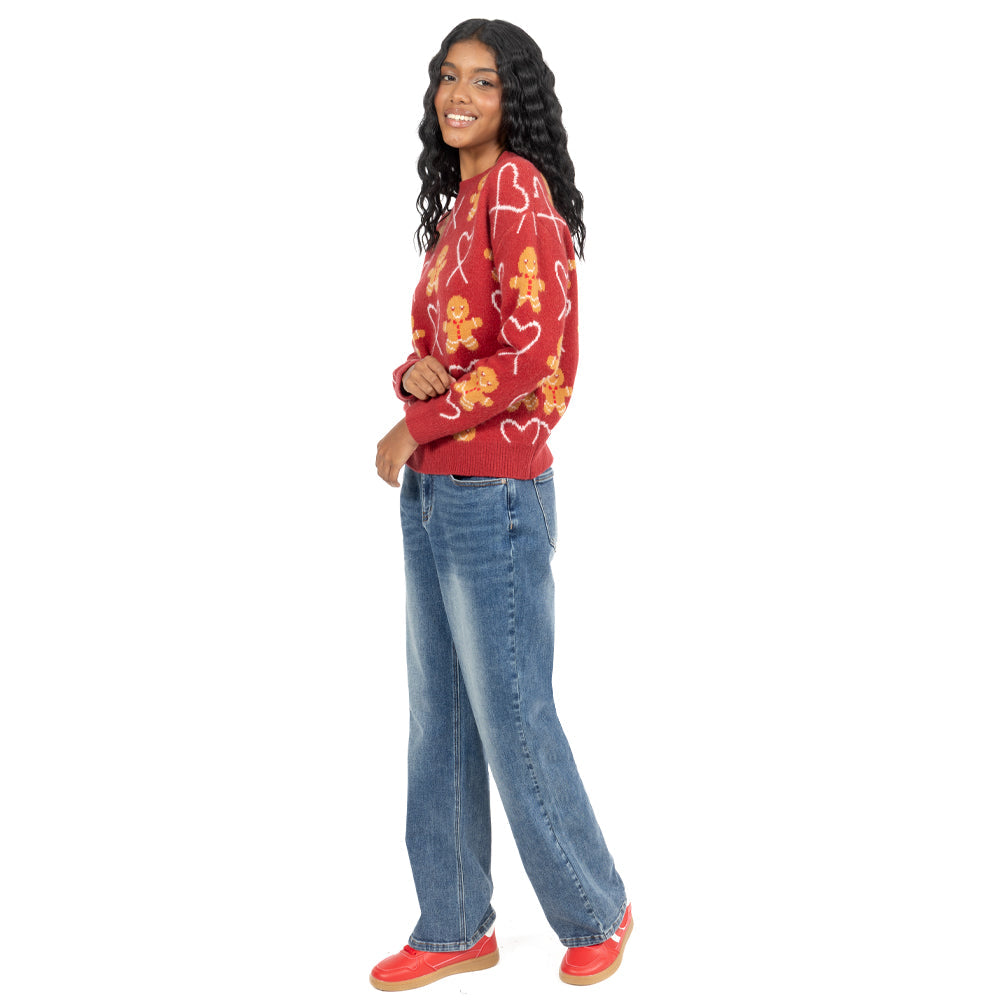 Holiday mood on. Dale un upgrade festivo a tus looks con este sweater rojo de gingerbread vibes: tejido suave, cuello redondo y un estampado de galletas y corazones que grita season-ready sin perder el toque chic.