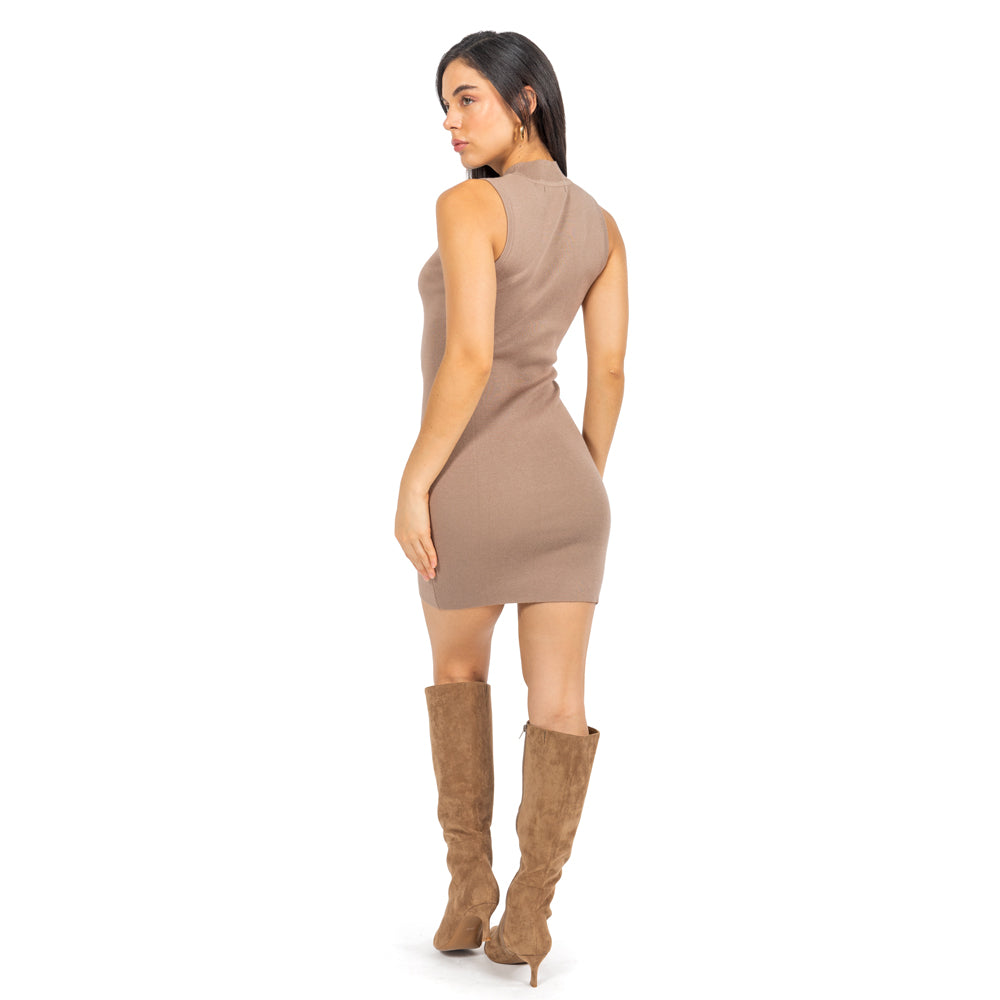 Tu new go-to dress. Este vestido tejido slim fit sin mangas con cuello alto en tono taupe eleva cualquier look con una vibra minimal y muy chic. Silueta ceñida, largo mini y tejido suave que abraza tus curvas: del brunch al date night, it’s a total yes.