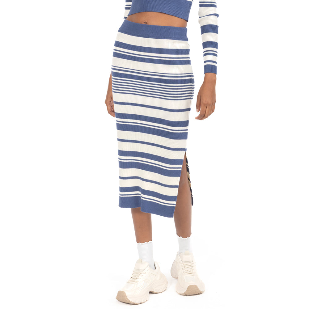 Ready to add-to-cart? Eleva tu clóset con esta falda midi tejida de punto: falda de rayas mujer, falda acanalada, slim fit, cintura alta, abertura lateral.