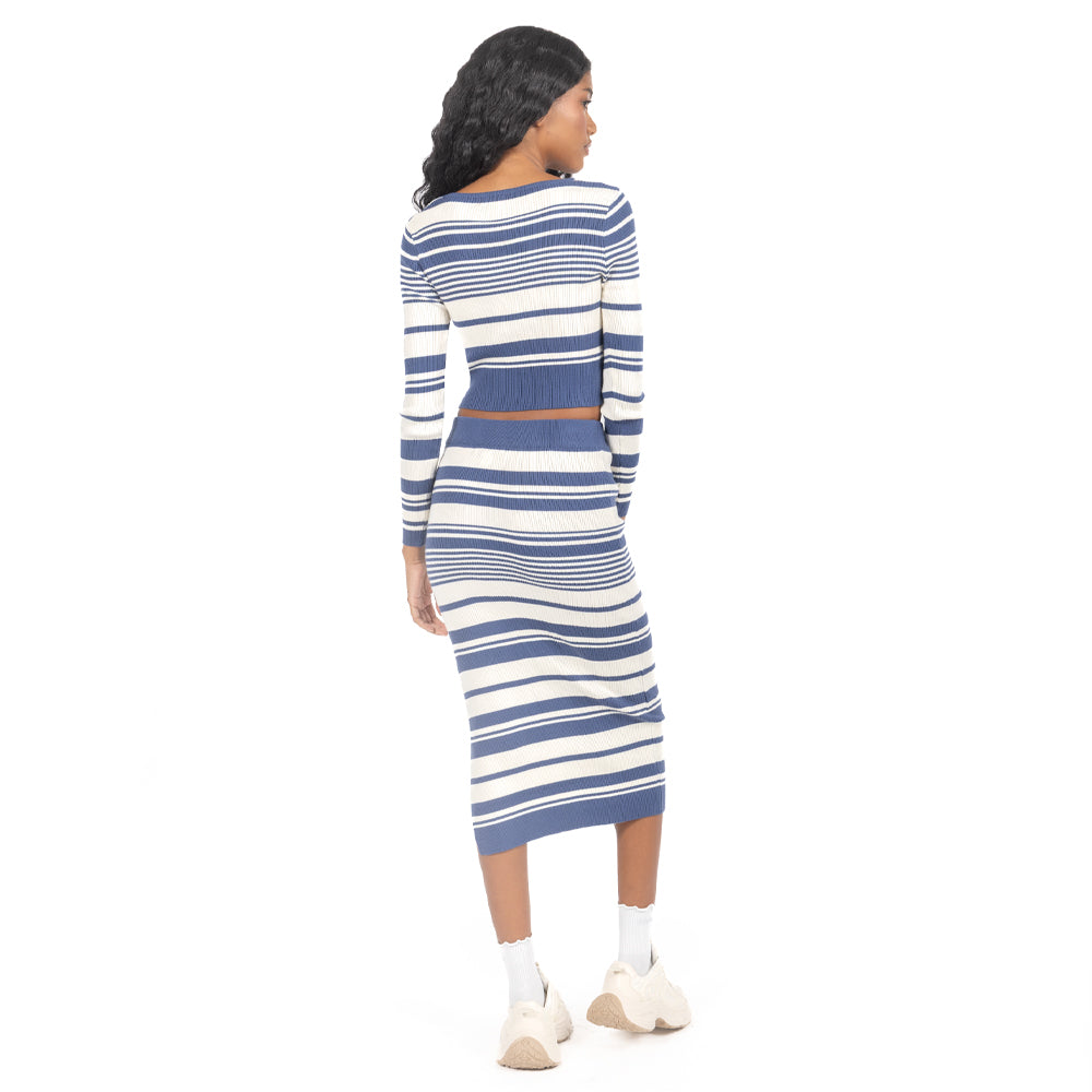 ? Stripe it up. Esta falda tejida midi de rayas mezcla cozy-chic con actitud on trend: silueta slim, abertura lateral y pretina alta que abraza la cintura. Fácil de combinar, comfy to wear y perfecta para un look day to night con sneakers o botines.