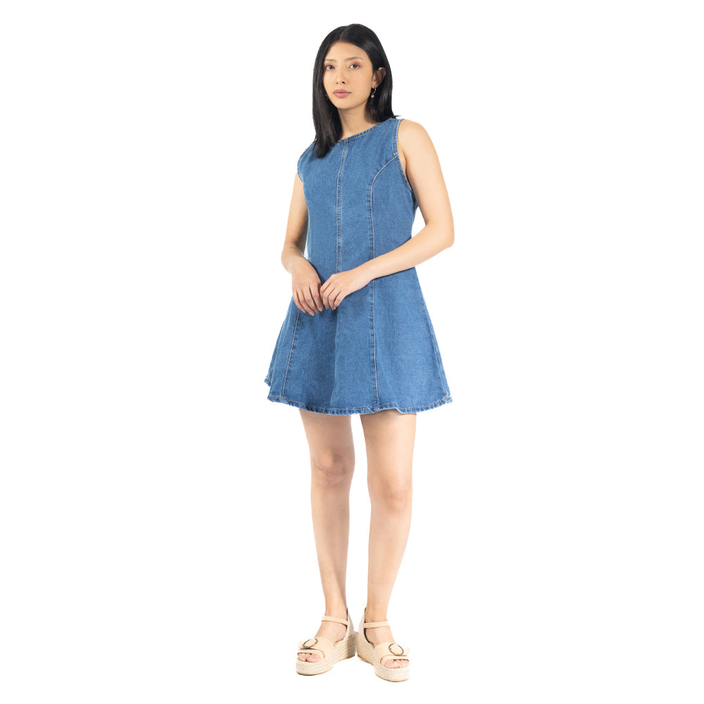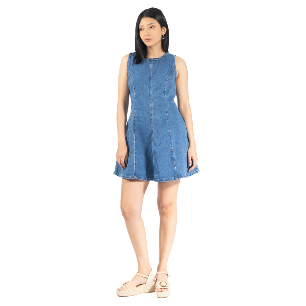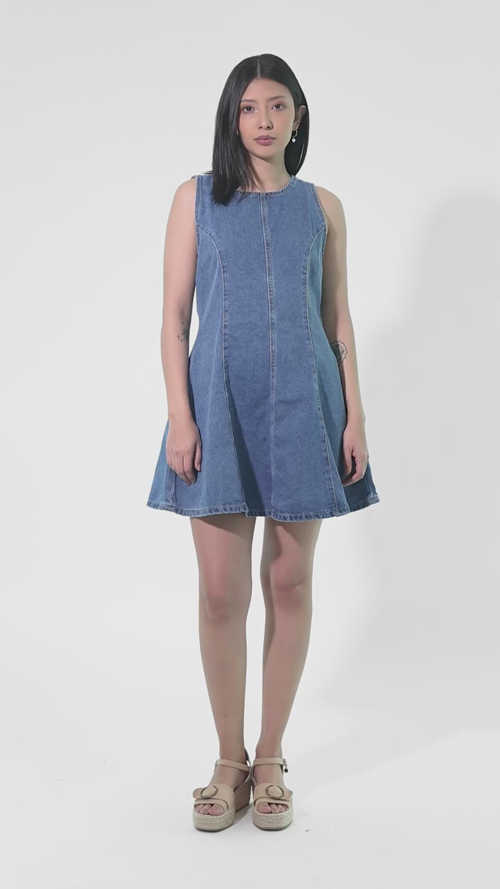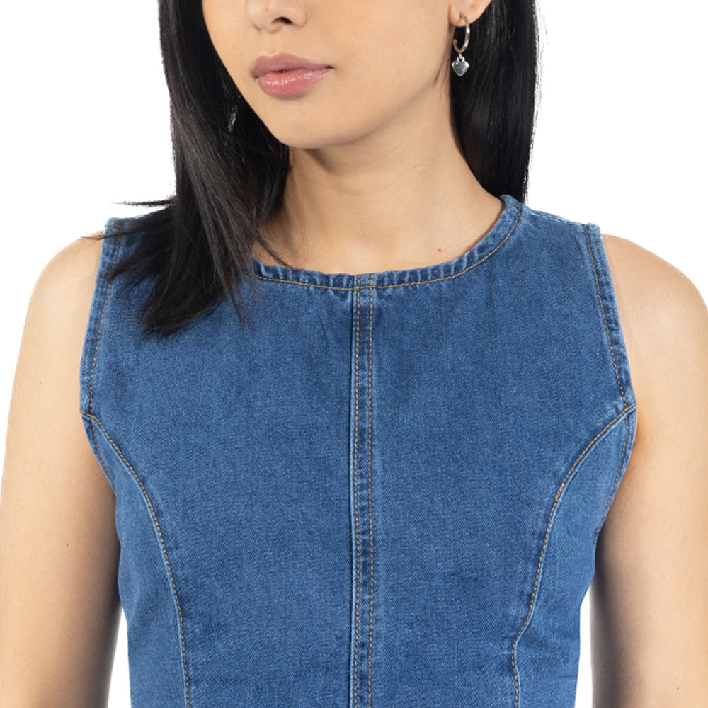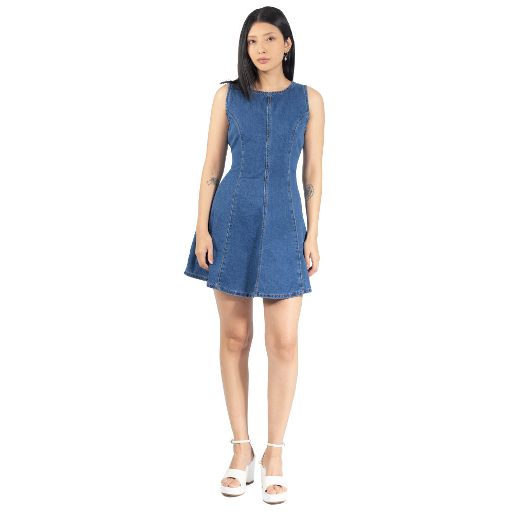 Vestido denim sin mangas con cortes al frente y falda de línea amplia, para un look marcado arriba y con más movimiento abajo.