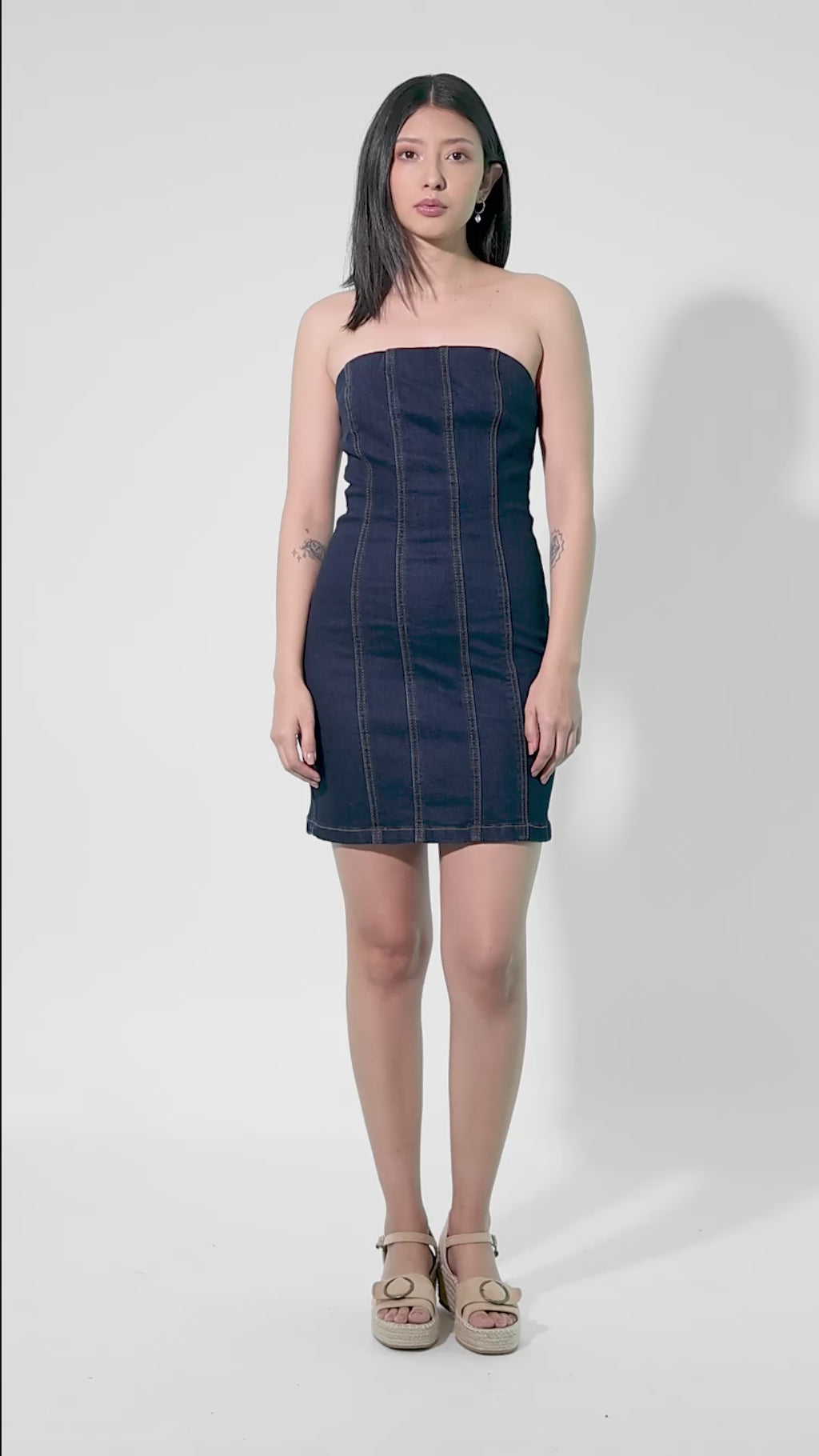 Vestido strapless denim con ajuste más pegado al cuerpo y largo corto, para un look limpio y más marcado en la silueta.